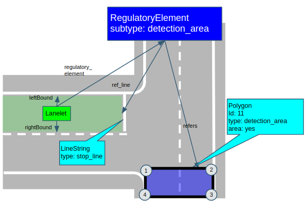 This regulatory element specifies region of interest which vehicle must pay attention whenever it is driving along the associated lanelet. When there are any obstacle in the detection area, vehicle must stop at specified stopline