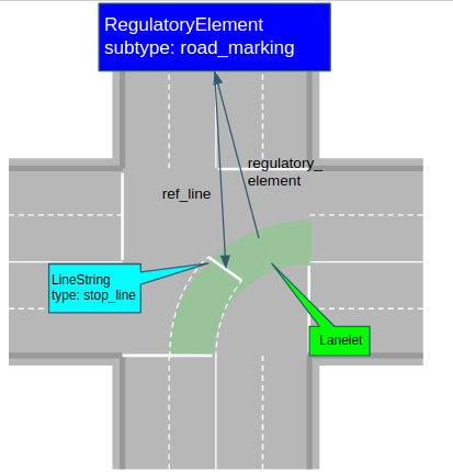 This regulatory element specifies related road markings to a lanelet as shown below.